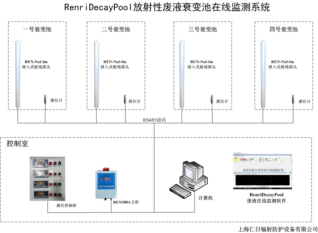 本系統是以工控機或商業臺式計算機作為上位機,以若干液位測控儀和若干REN300在線輻射安全報警儀及射線探頭為下位機,通過屏蔽電纜線組成一個RS-485通訊網絡。在線監測系統軟件是整套系統的大腦,由其完成全部系統的自動化控制過程。